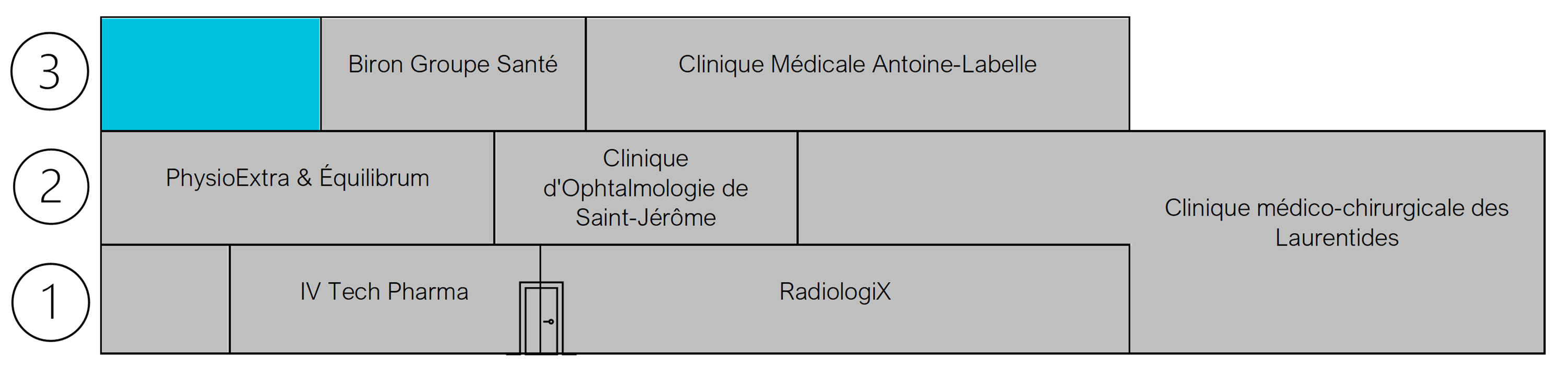 À proximité de l’hôpital de St-Jérôme Local situé au 3e étage Une grande fenestration Immeuble à vocation uniquement médicale Une construction de haute qualité 247 cases de stationnement exclusives à l’immeuble Superficie de 2200 Situé au 305, rue du Docteur-Charles-Léonard Contactez-nous pour obtenir plus d'information sur un espace 450 437-9909 info@medifice.com